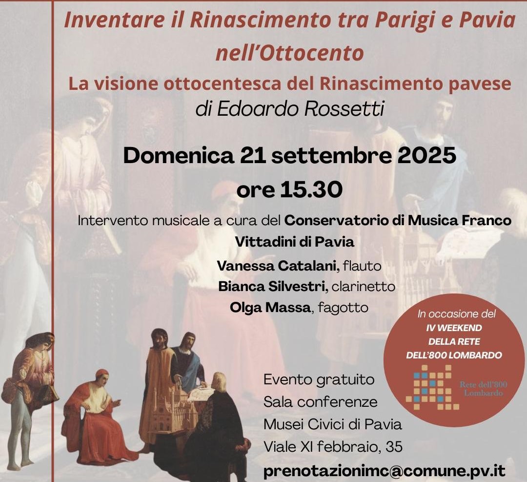 Domenica 21 settembre 2025 – ore 15:30 Musei Civici di Pavia, Sala Conferenze Conferenza Uno:Uno. A tu per tu con l’opera. Inventare il Rinascimento tra Parigi e Pavia nell’Ottocento La visione ottocentesca del Rinascimento pavese di Edoardo Rossetti Prosegue con un nuovo appuntamento la rassegna di Uno:Uno. A tu per tu con l’opera, sostenuta...